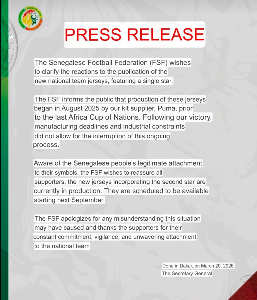“The Senegalese Football Federation (FSF) wishes to inform the public that production of these shirts was launched in August 2025 by our kit supplier Puma, ahead of the last Africa Cup of Nations. Following our victory, manufacturing deadlines and industrial constraints did not allow for this process, which was already underway, to be halted. Aware of the Senegalese people’s legitimate attachment to their symbols, the FSF wishes to reassure all supporters: the new shirts featuring the second star are currently in production. They are expected to be available from next September.”