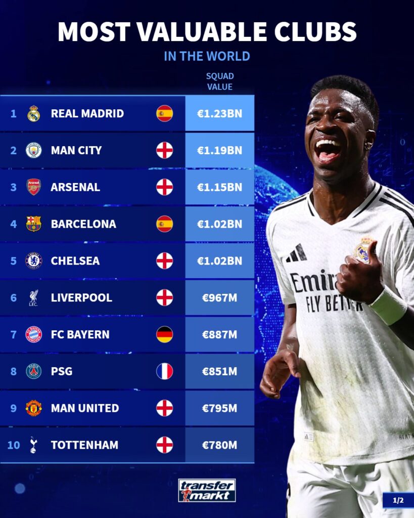 This year’s rankings reflect a strong dominance of Premier League clubs, which account for six of the top ten positions, underscoring the financial strength and global appeal of English football.